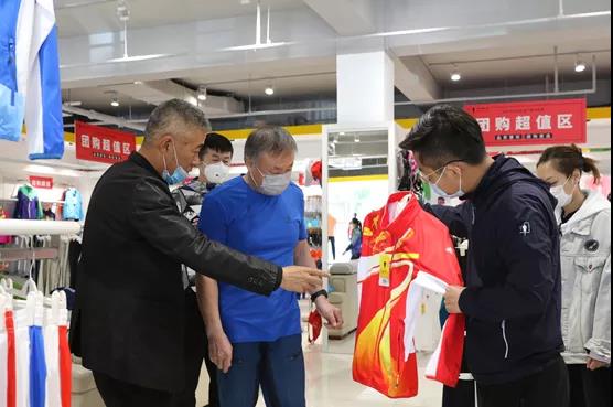 建侬體(tǐ)育董事長王玉明(míng)(左)、中國著名登山(shān)家(jiā)夏伯渝(中),建侬體(tǐ)育北京分公司總經理(lǐ)羅鑫垚(右),三人(rén)正在介紹建侬體(tǐ)育原創設計(jì)的中國傳統元素領獎服
