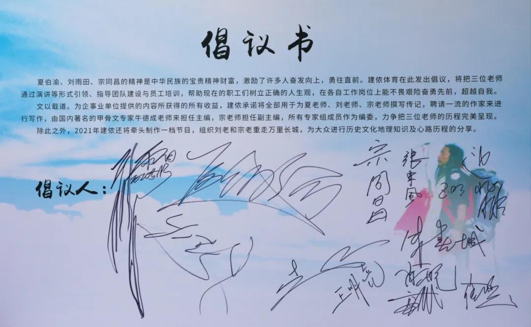 5月14日,“雨田之路·胸懷祖國”——劉雨田36周年探險生(shēng)涯分享會(huì)在北京昌平區(qū)建侬書(shū)院成功舉行(xíng)。分享會(huì)上(shàng),建侬體(tǐ)育董事長王玉明(míng)先生(shēng)發起了全民健身專家(jiā)組的倡議,與會(huì)的十餘位專家(jiā)紛紛在倡議書(shū)上(shàng)簽字。這一行(xíng)動表明(míng)建侬體(tǐ)育專家(jiā)組正式成立,在助力全民健身的路上(shàng)再次加速。